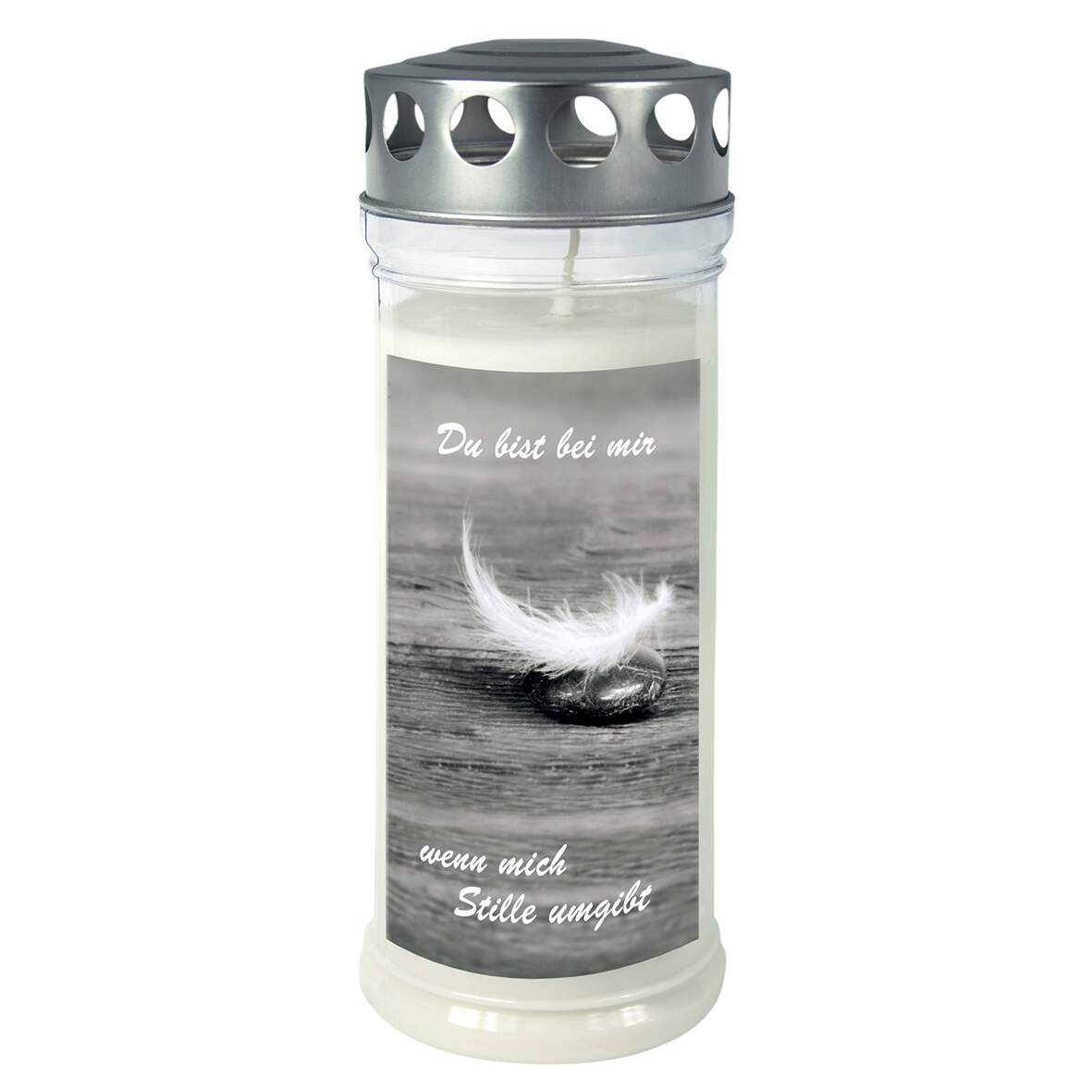 Gedenk-Kerze groß Feder/Stein Silberdeckel DM 7,5cm H 21,5cm