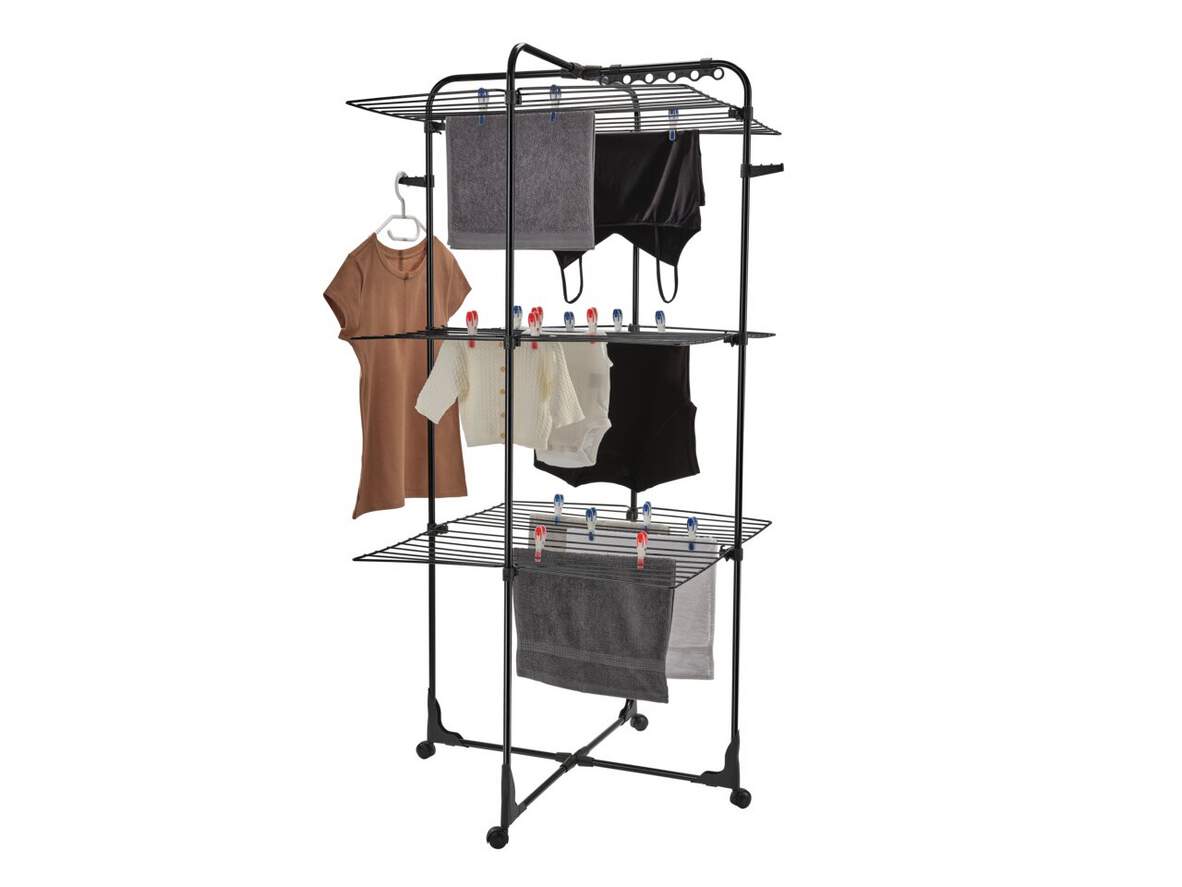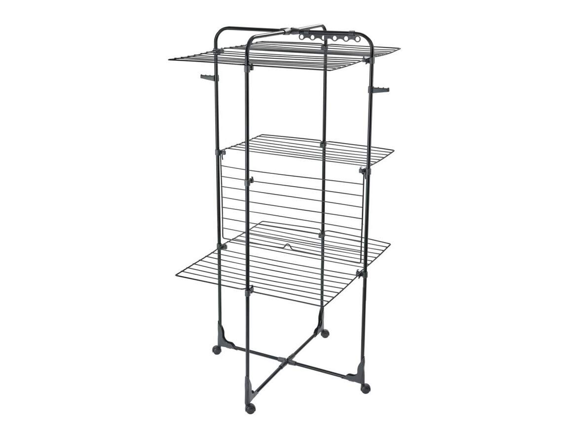 Weitere Produktmerkmale: Gitter, individuell abklappbar für große Wäschestücke, Rahmen für halbseitige Nutzung abklappbar, drei Trockenebenen